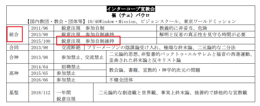 統合派はインターコープについて2011年第96回総会で「鋭意注視・参加自制」を決議した。その後、インターコープからの申し出や一部教団牧師から決議規定の改正を見直す意見が上がり、同委員会は2013年と2015年の2度にわたり再審を行なったが、従来の「鋭意注視・参加自制」規定を解除することはできなかった。今年9月の総会で決議されれば4度目の規定を下すことになる。