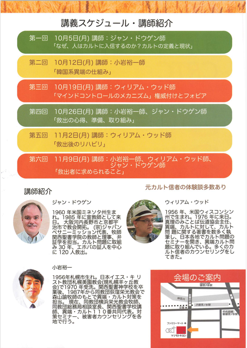 第二回となるカルト救出者育成コースが2020年10月5日~11月9日までお茶の水クリスチャンセンター(東京都千代田区)で開催される。参加申し込み、お問い合わせはチラシに記載の連絡先まで。