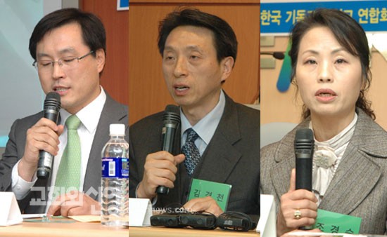 左からキム・ジンホ元摂理事務局長、キム・ギョンチョン元摂理神学校校長、チョウ・ギョンスク元摂理ソウル地域長が会見にのぞんだ(写真:教会と信仰)